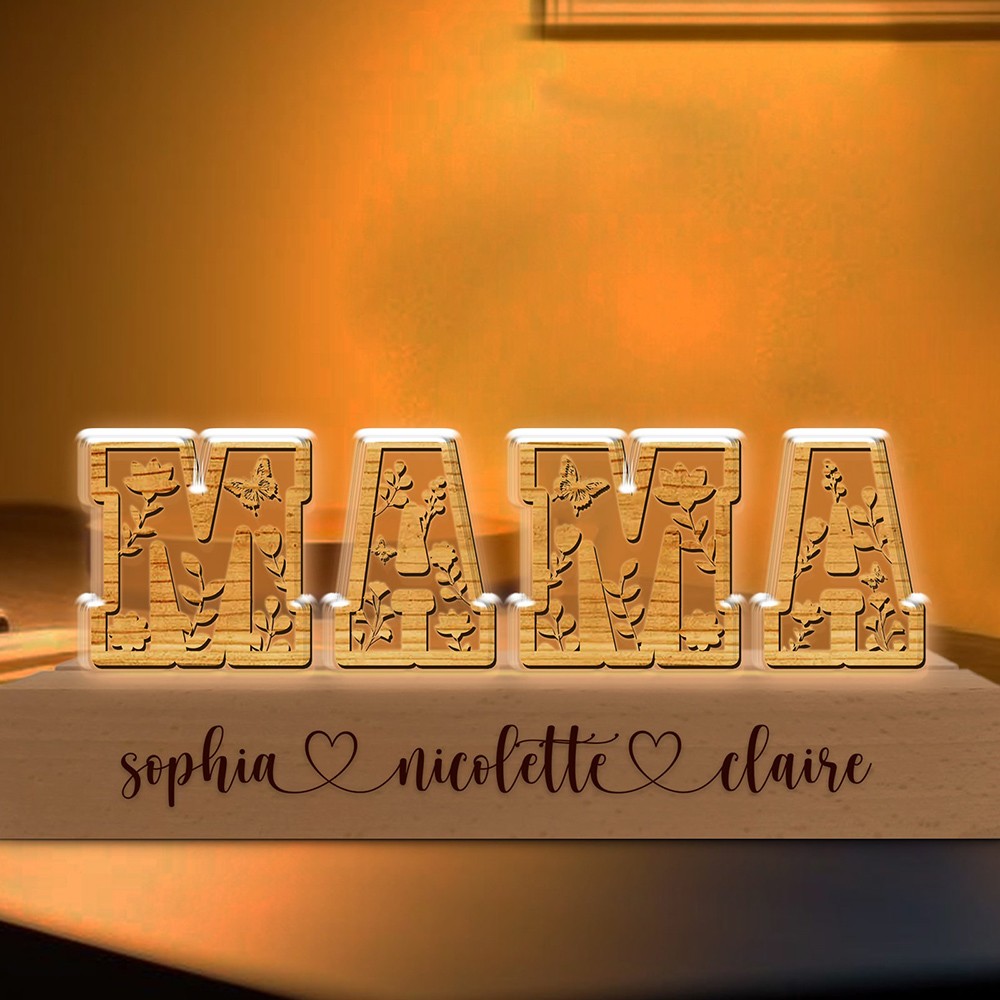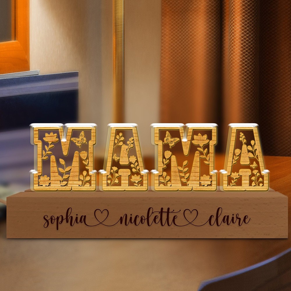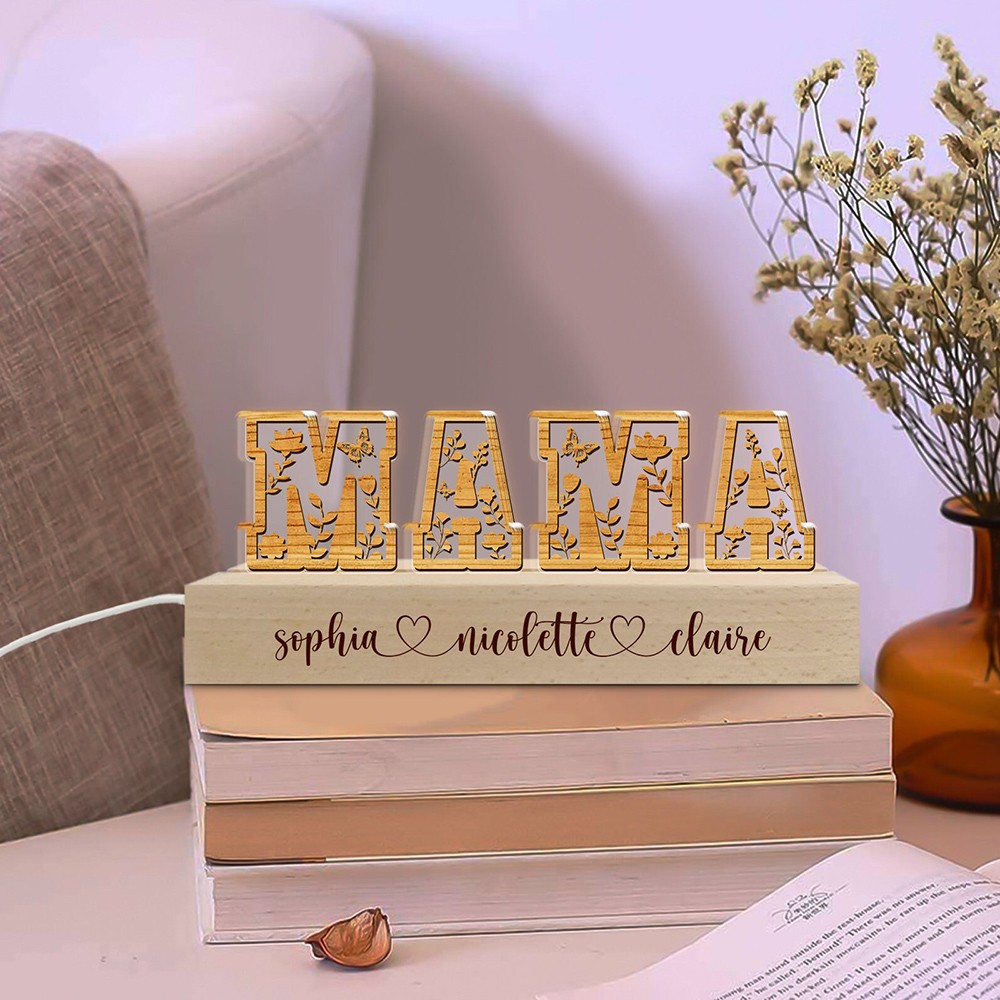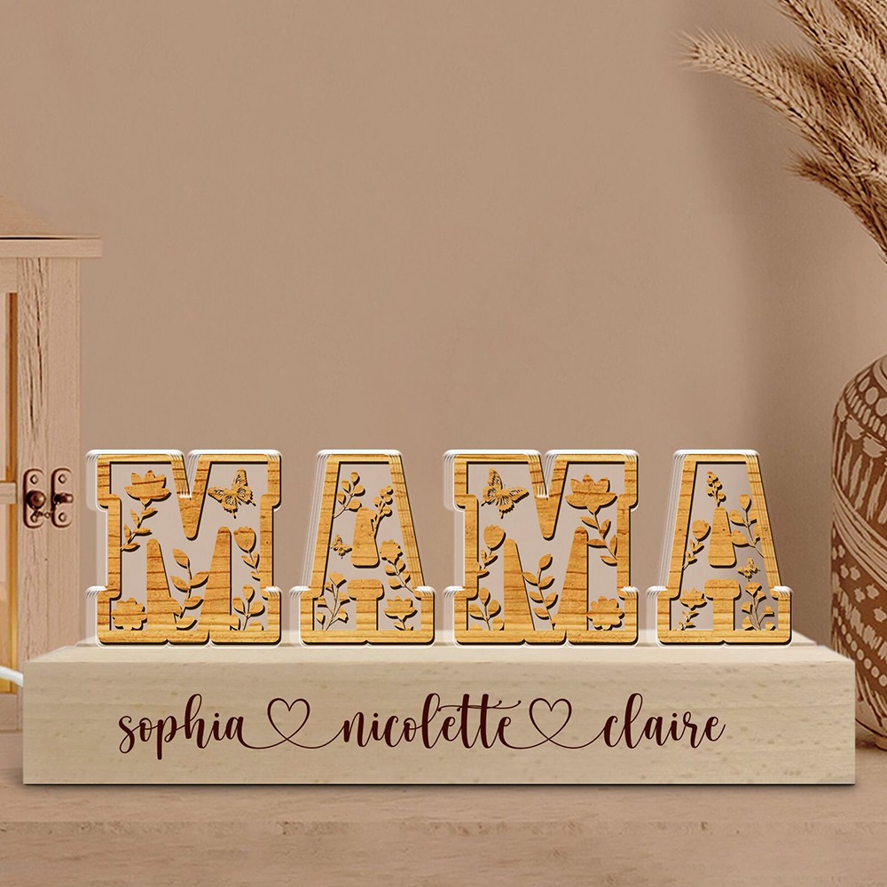 Romantic dried flower alphabet lamp with a "mom" look, each letter is infused with flowers for romance and meaning. The wooden base can be customized with the child's name or words to say to the mother, warm and unique. The warm light from the LED lights can render the night atmosphere, perfect for decoration.