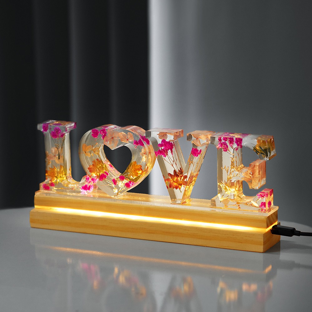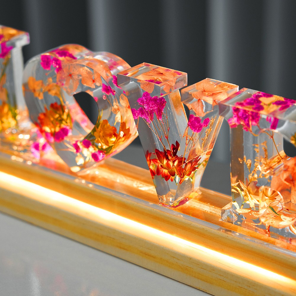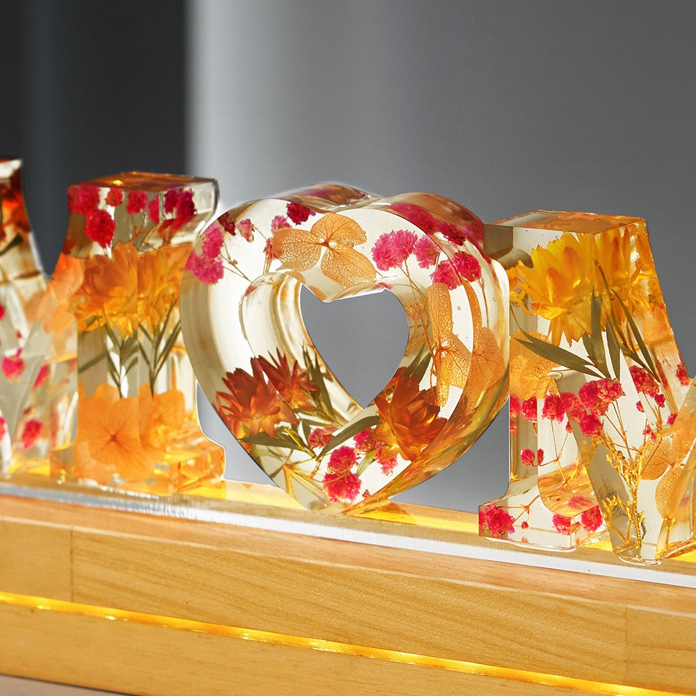 Romantic dried flower alphabet lamp with a "mom" look, each letter is infused with flowers for romance and meaning. The wooden base can be customized with the child's name or words to say to the mother, warm and unique. The warm light from the LED lights can render the night atmosphere, perfect for decoration.