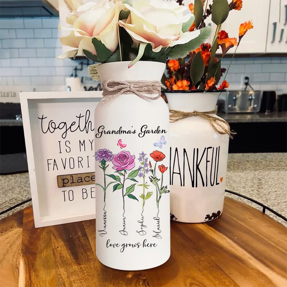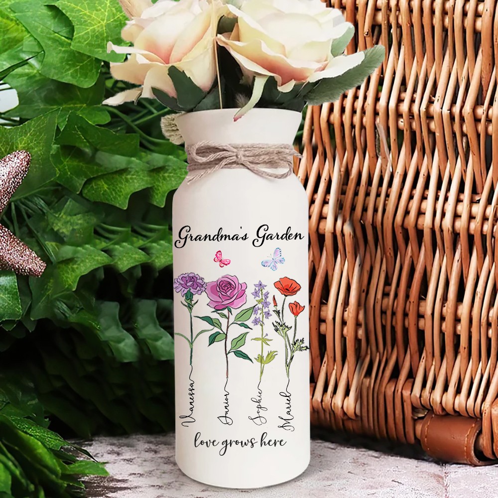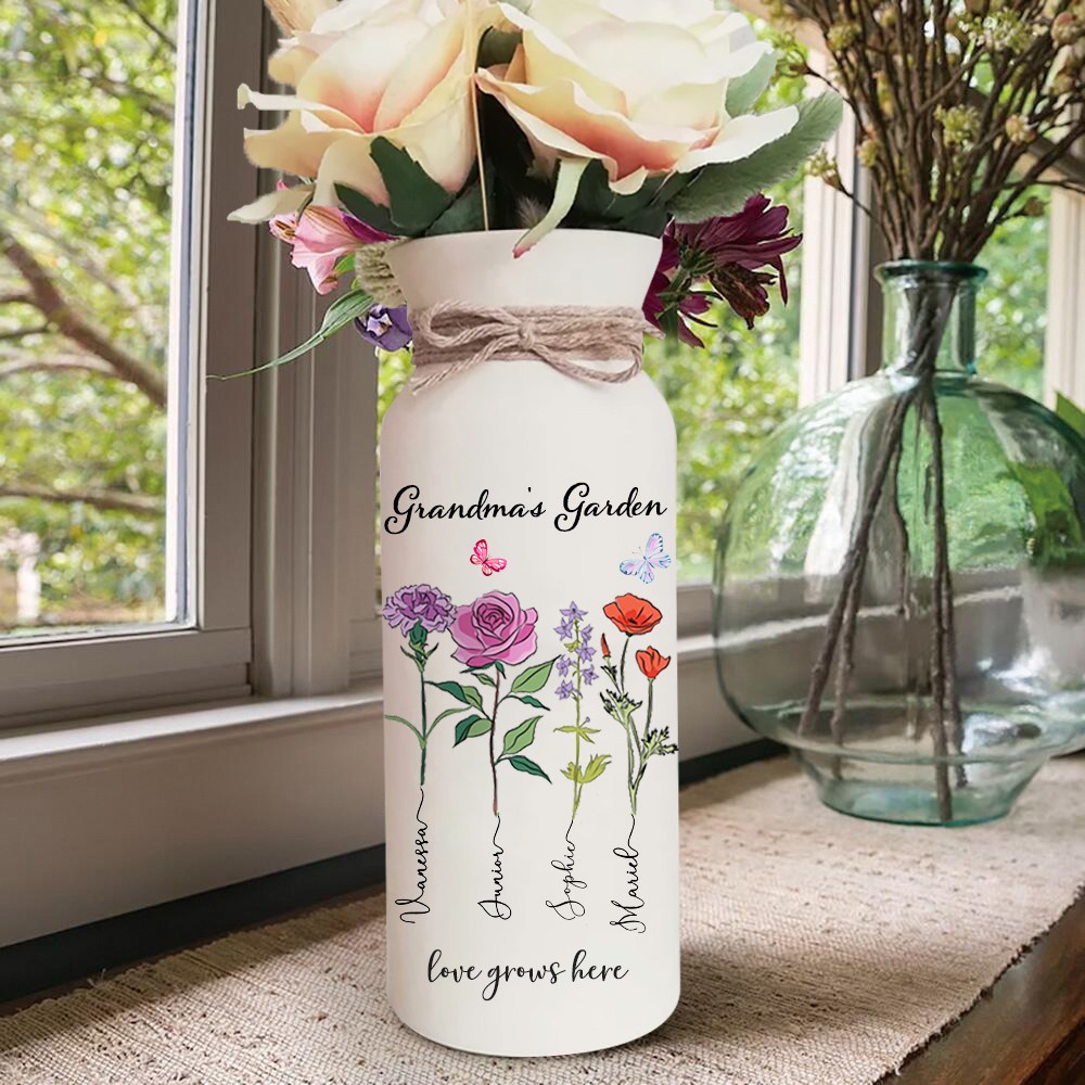 Personalized Grandma's Garden Outdoor Flower Vase With Grandkids Name and Birth Flower For Mother's Day