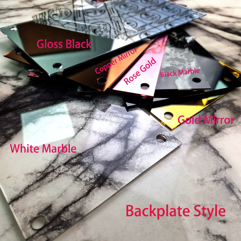 Our front section colours encompass the sophisticated Matte Gray (Anthracite), the timeless Matte Black, and the pristine Matte White. For the backplate, choose from Silver Mirror, Gloss Black, Copper Mirror, Rose Gold (Pandora-style Rose!), Gold Mirror, White Marble, and Black Marble